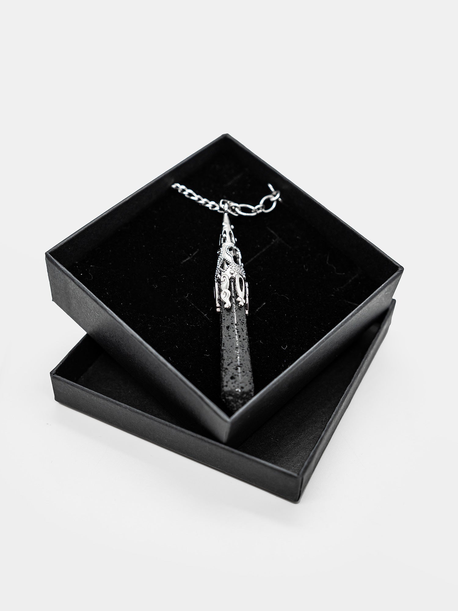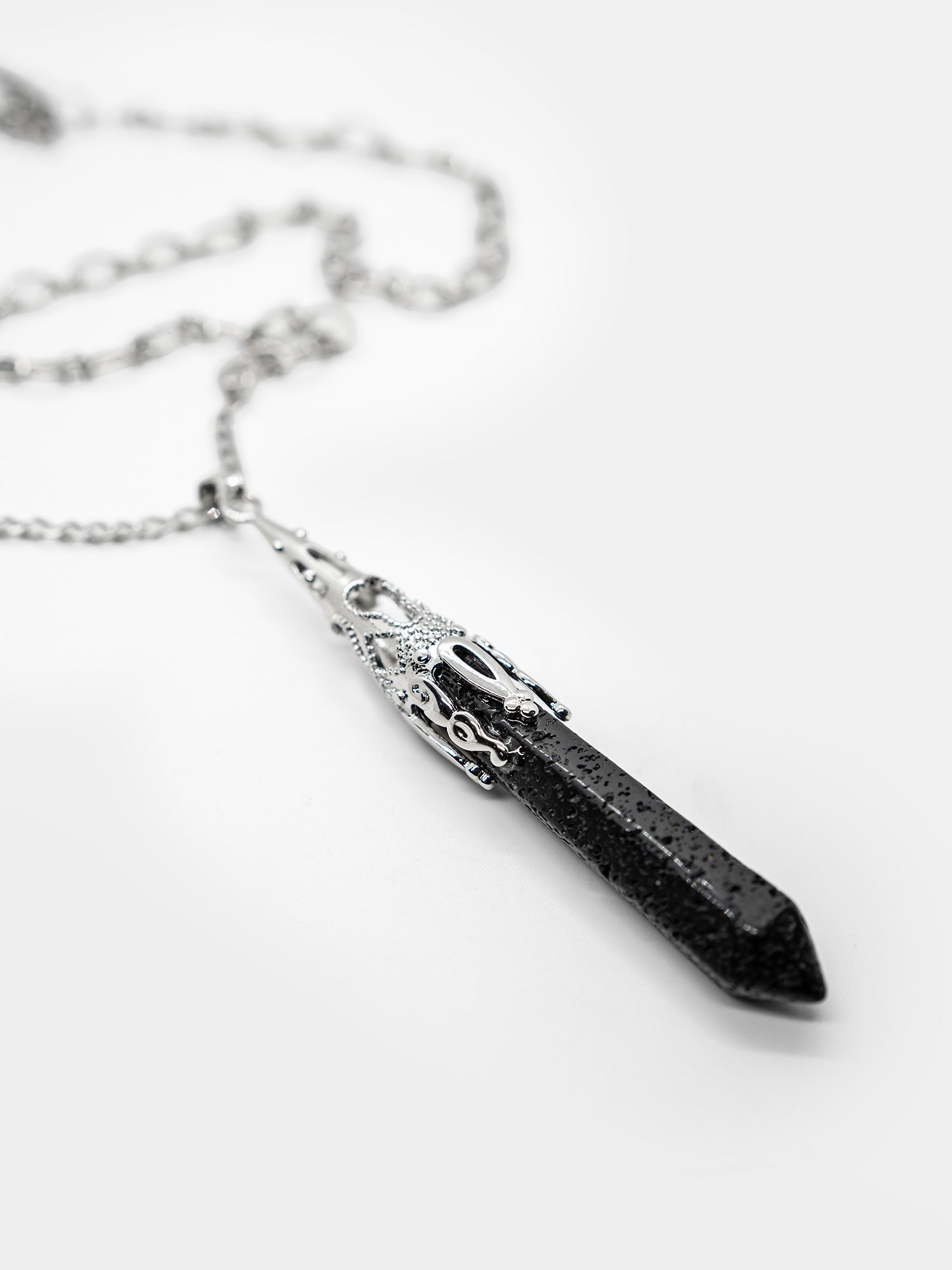 Long necklace made of two different chains. The large lava stone pendant with a beautifully decorated fitting draws attention.