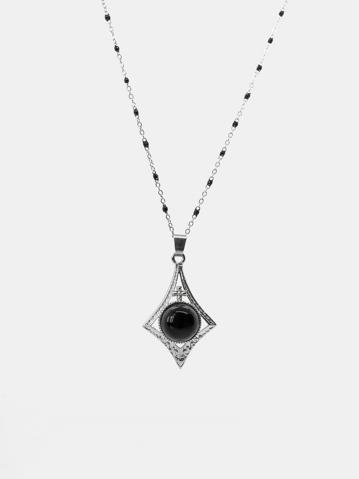 Centralnym elementem naszyjnika jest zawieszka z obsydianem osadzonym w zdobionej, srebrzystej ramie o smukłym, gotyckim kształcie.