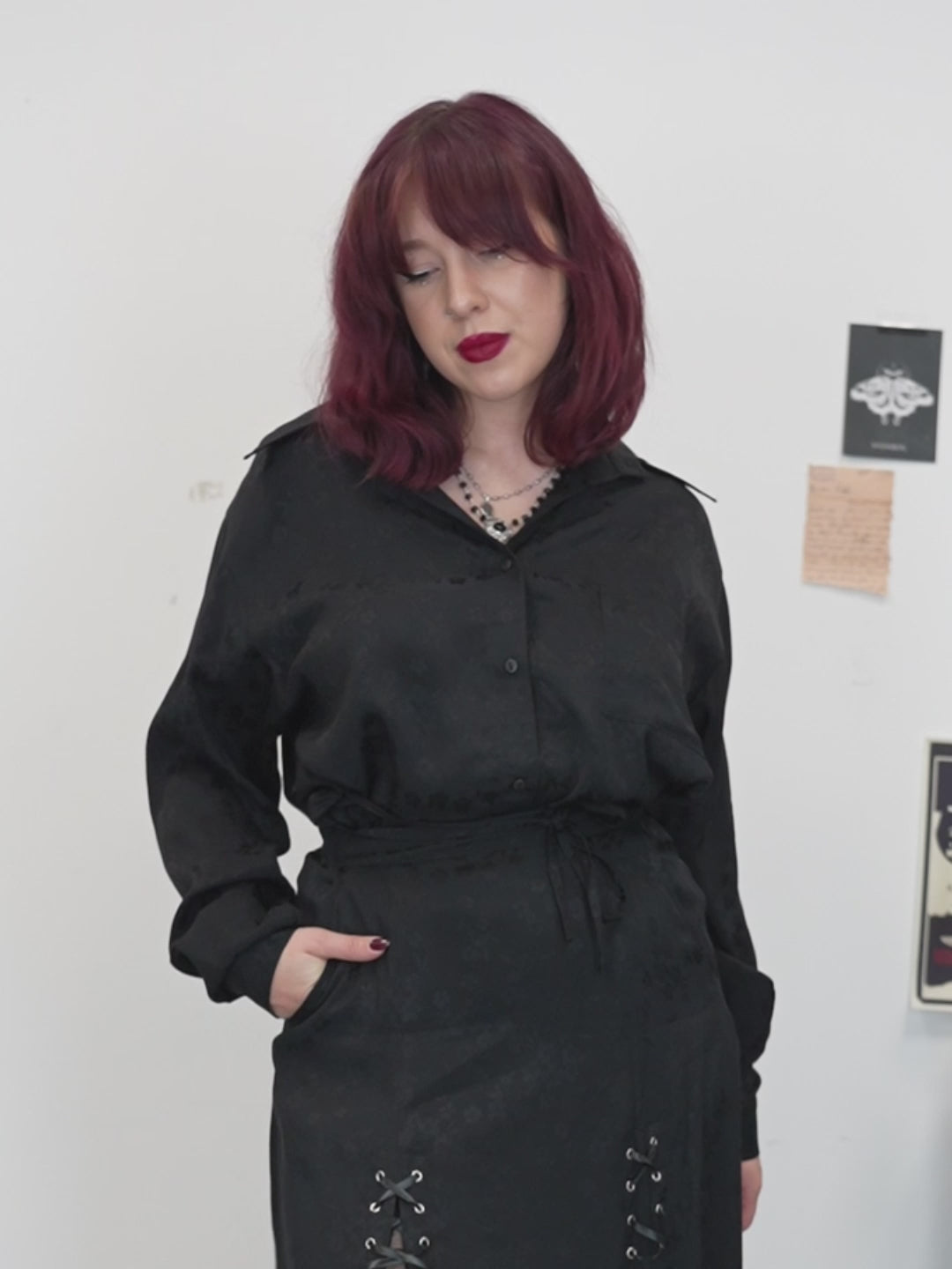 Gabriela, w bordowych włosach, ma 165cm wzrostu, 97cm w biuście, 75cm w talii, 100cm w biodrach i ma na sobie rozmiar XS/S.