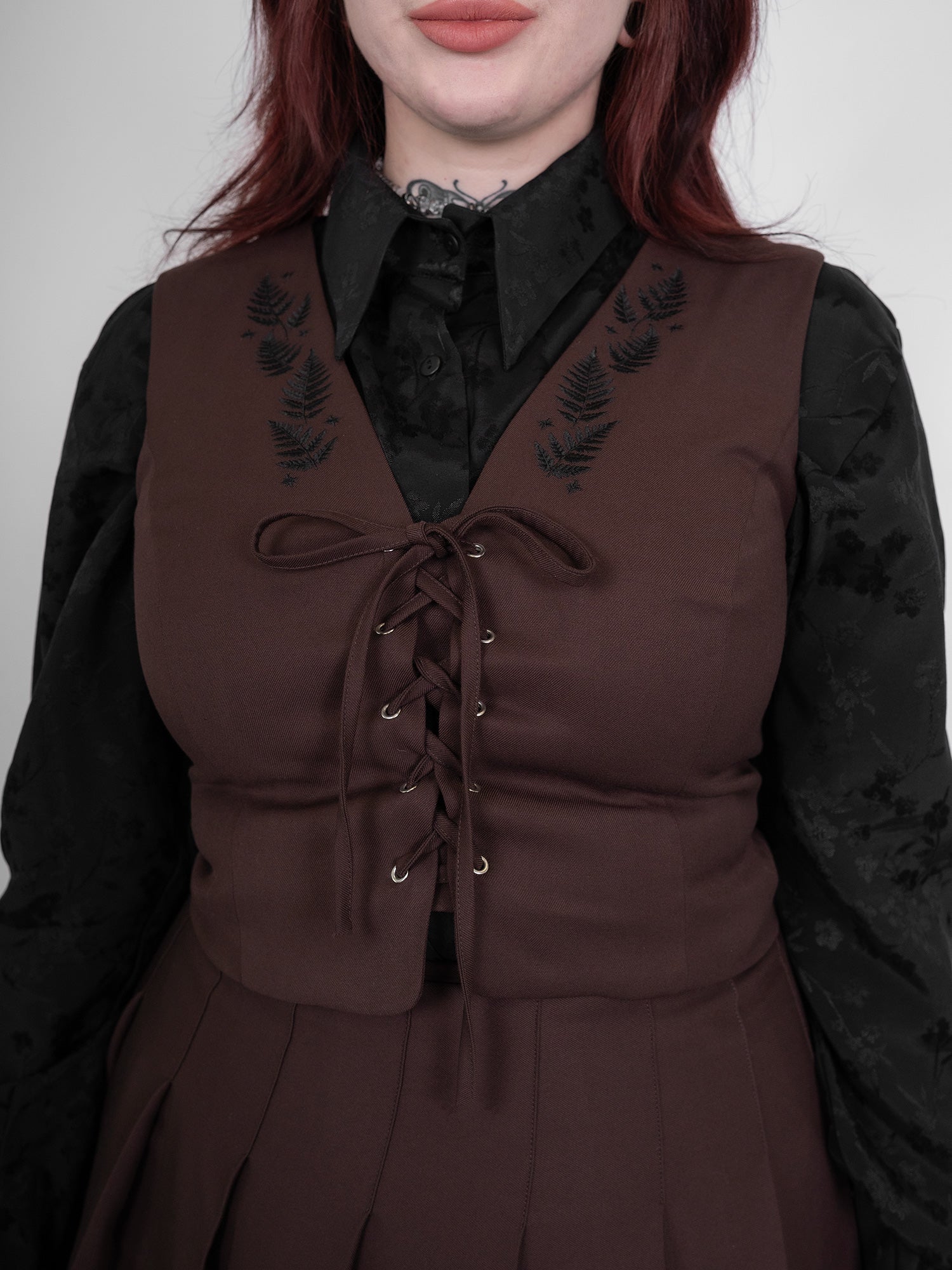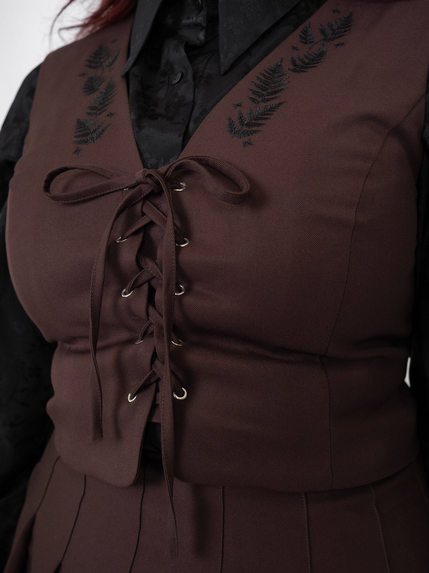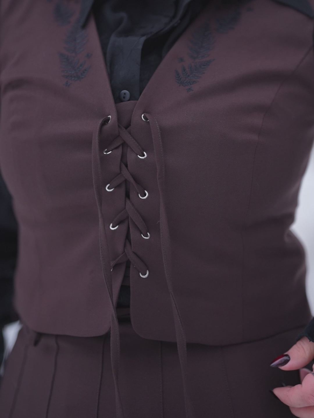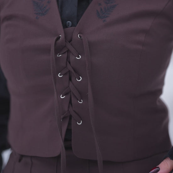 Gabriela, w bordowych włosach, ma 165cm wzrostu, 97cm w biuście, 75cm w talii, 100cm w biodrach i ma na sobie rozmiar S.