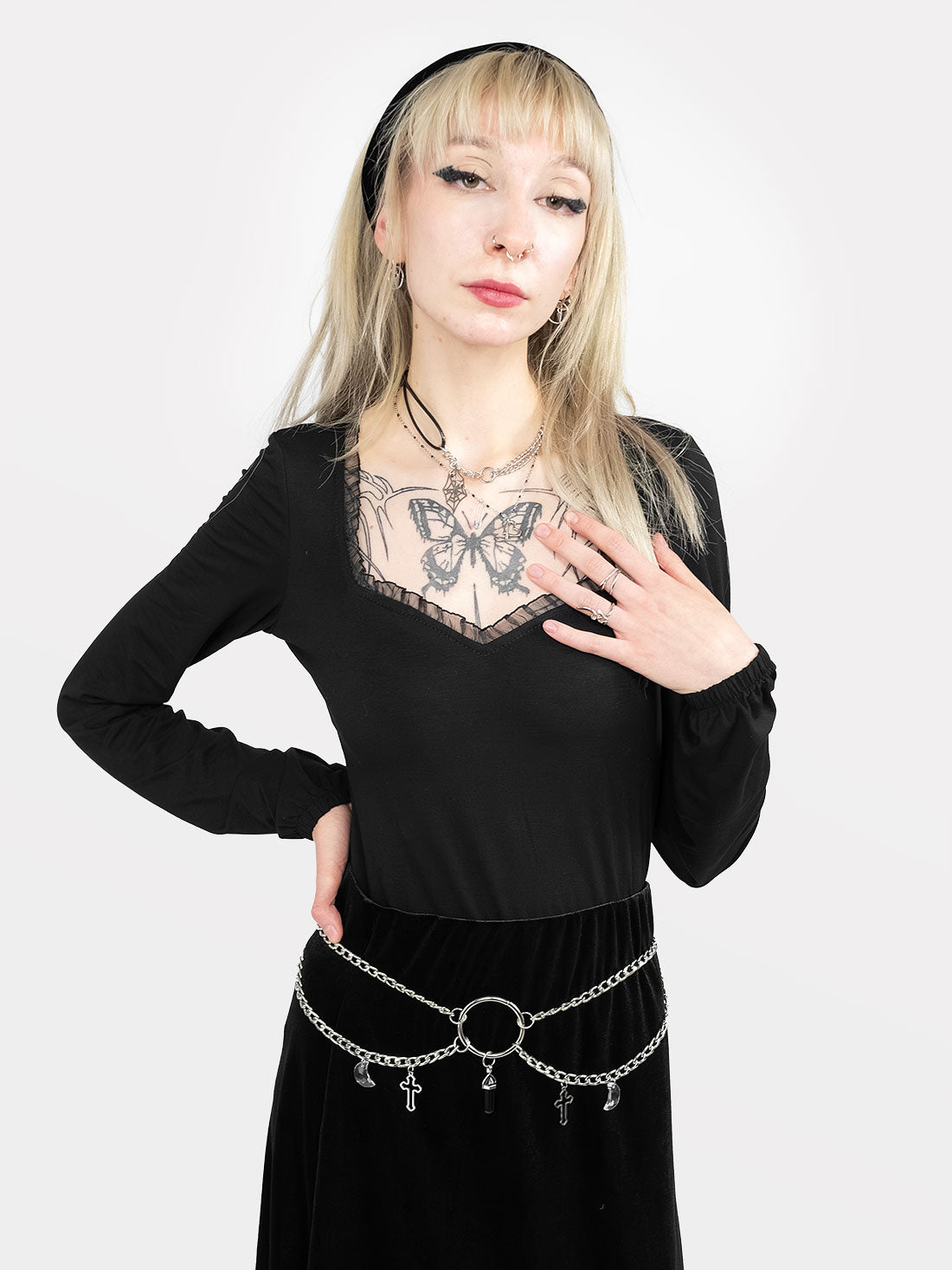 Aleksandra ma 170cm wzrostu, 90cm w biuście, 74cm w talii, 90cm w biodrach i ma na sobie rozmiar S.
