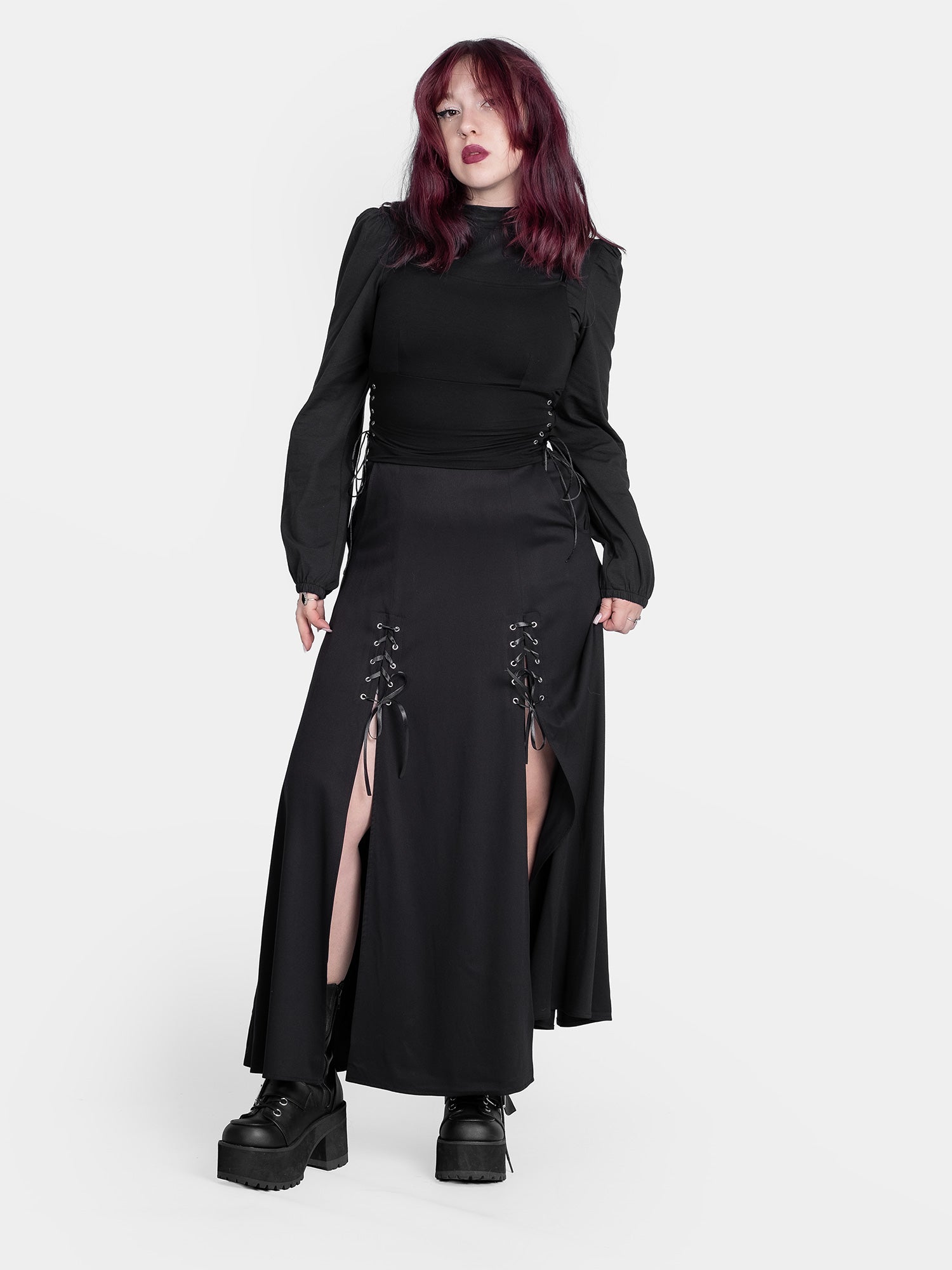She's like morphine on my mind... 🩸 Poznaj spódnicę Lacrimosa - ekstremalnie długą, z dwoma wycięciami połączonymi gotyckim wiązaniem.