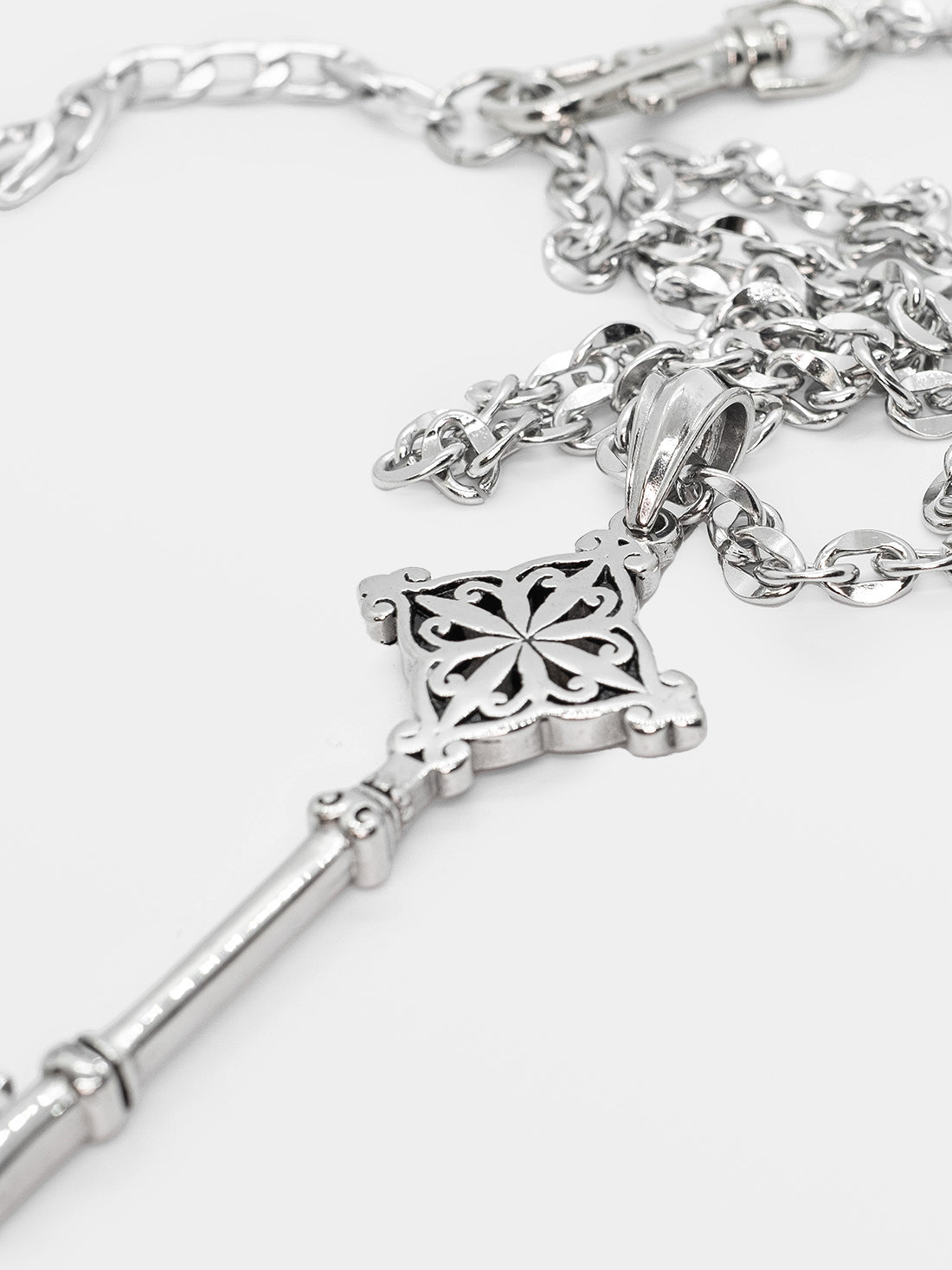 Ten długi naszyjnik wyróżnia się pięknym wisiorkiem w formie ozdobnego klucza, którego główka zdobiona jest finezyjnym wzorem przypominającym kwiatową rozetę.