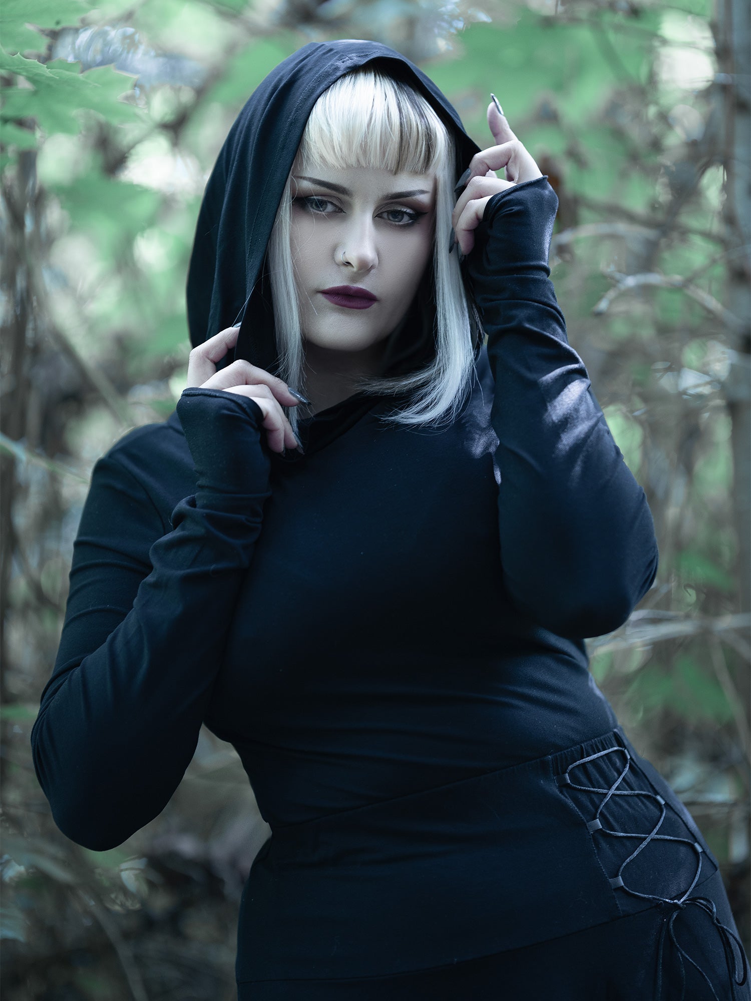 Maja, w czarnych włosach, ma 172cm wzrostu, 110cm w biuście, 88cm w talii, 105cm w biodrach i ma na sobie rozmiar XXL.