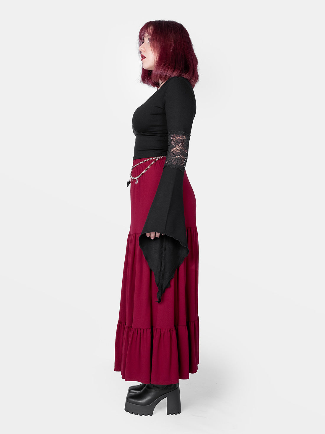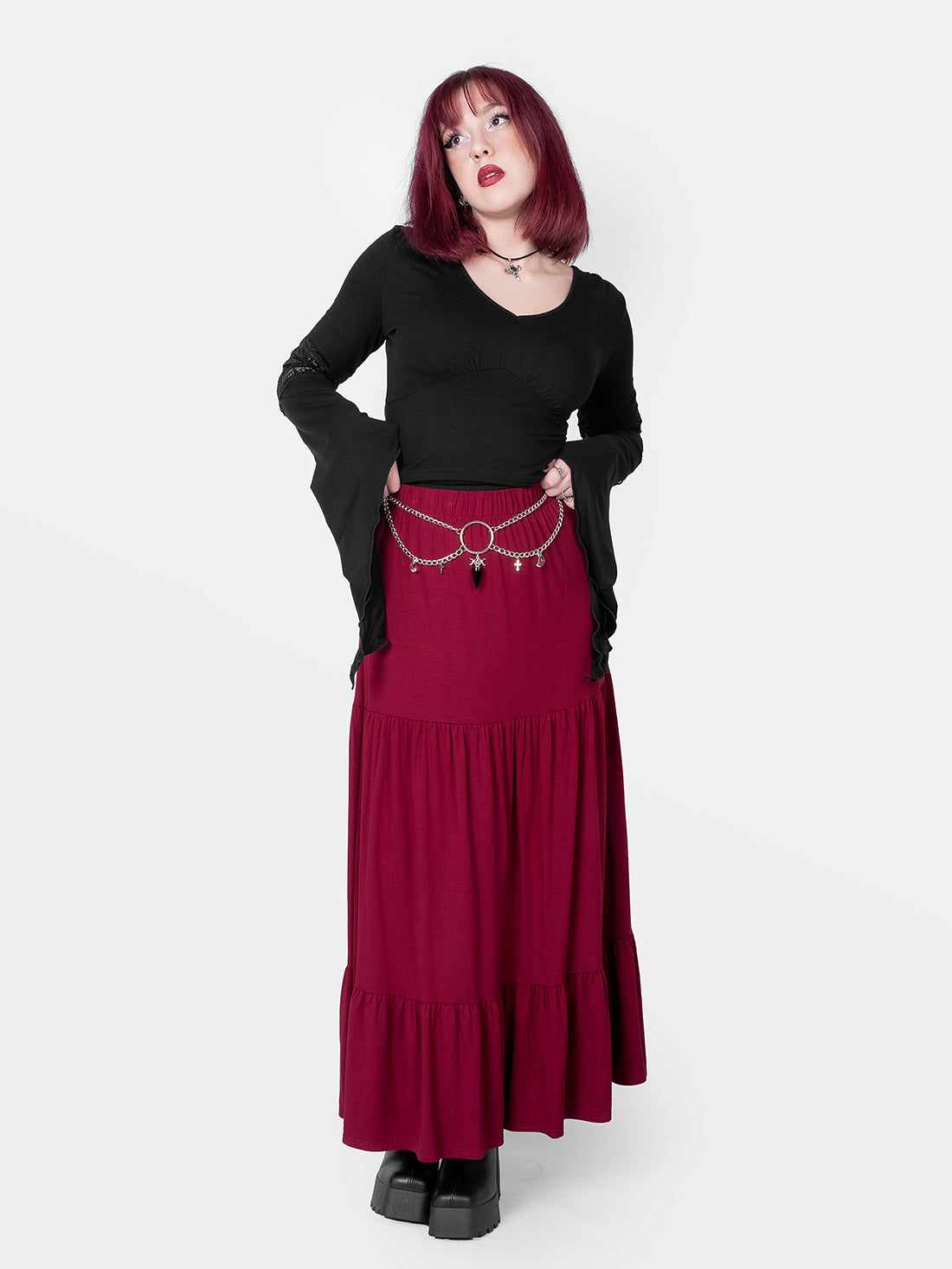 Maja, w malinowych włosach, ma 172cm wzrostu, 110cm w biuście, 88cm w talii, 105cm w biodrach i ma na sobie rozmiar XL/XXL.