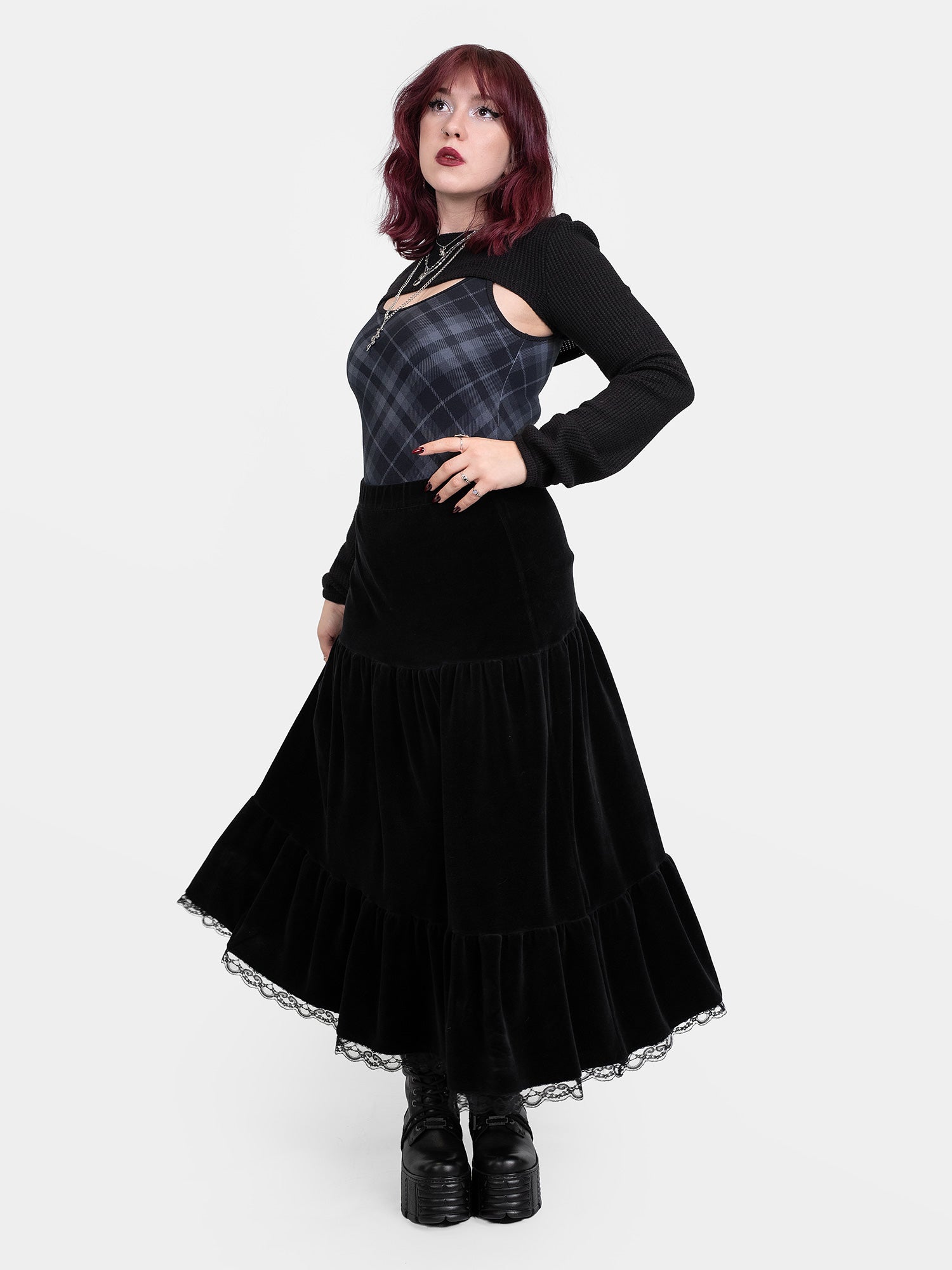 Gabriela, w bordowych włosach, ma 165cm wzrostu, 97cm w biuście, 75cm w talii, 100cm w biodrach i ma na sobie rozmiar M.