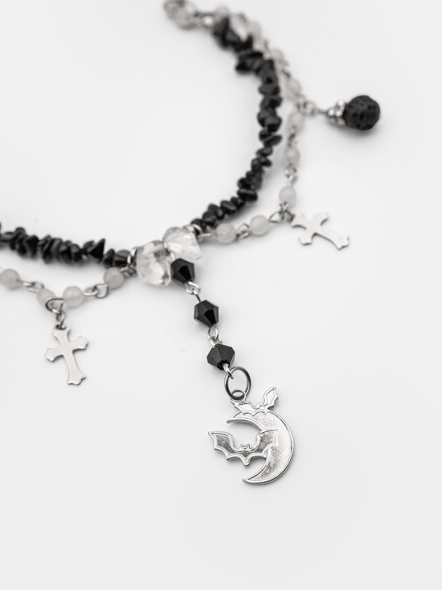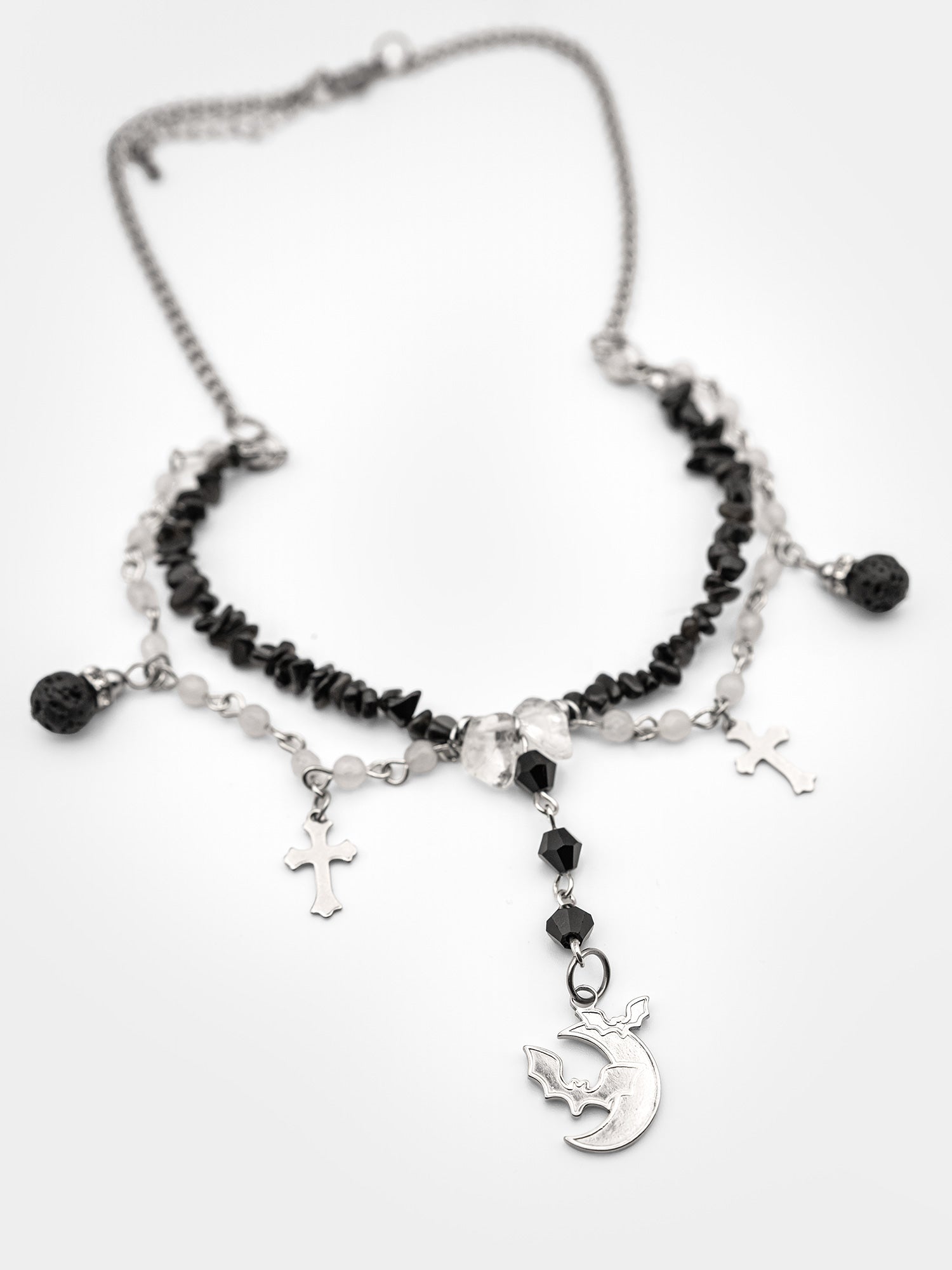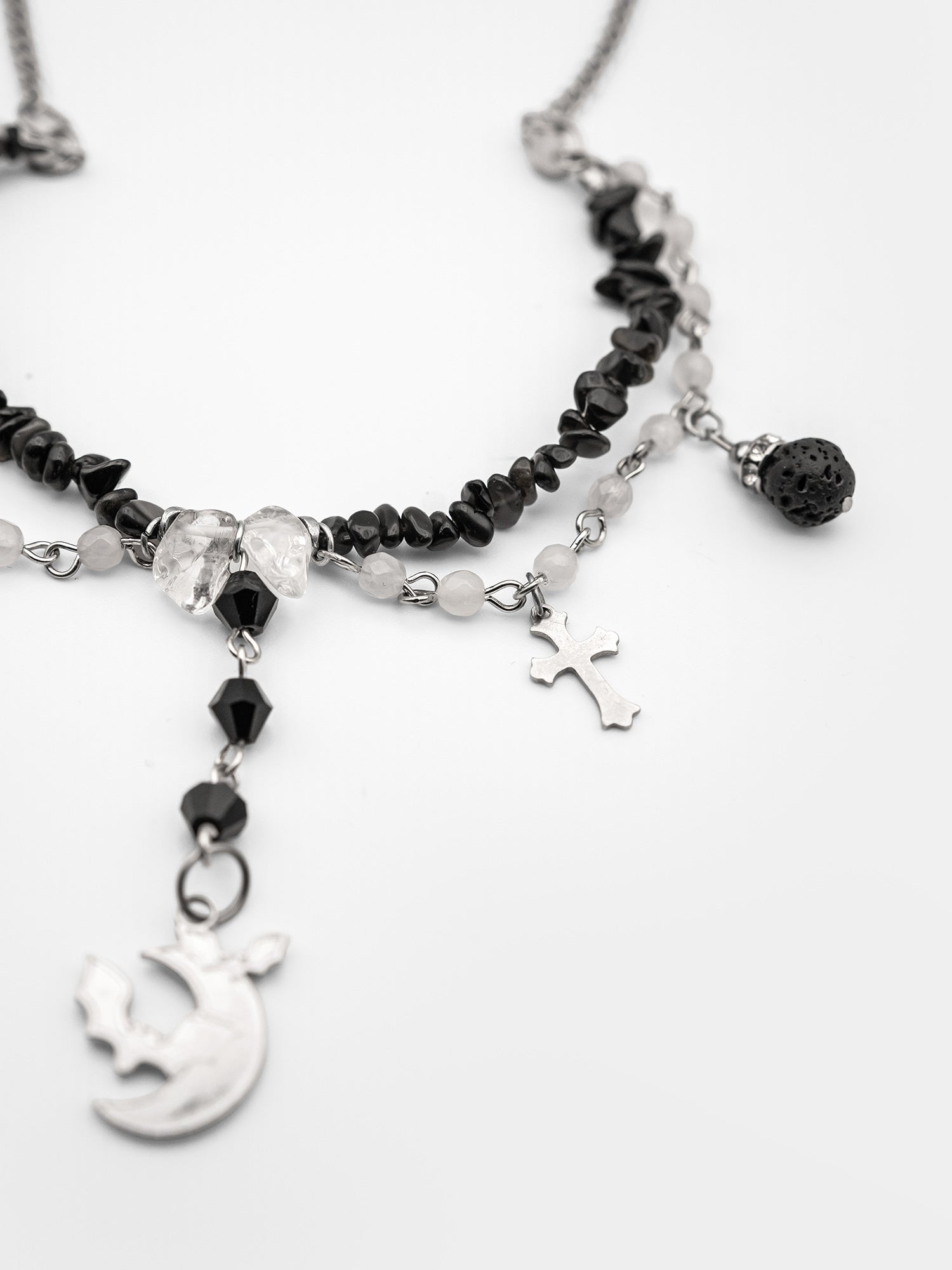 Choker został wykonany ręcznie przez babcię, używając naturalnych kamieni. Na chokerze znajdziesz nieregularne bryłki obsydianu iryzującego, z dodatkowymi wisiorami z łańcuszka z kryształu górskiego oraz z zawieszkami krzyży i kul lawy.