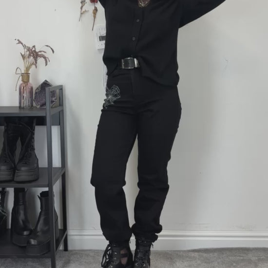 Kolekcja limitowana. To Twoje nowe, najwygodniejsze spodnie - obiecujemy! Idealnie dopasowana talia i wysoki stan wysmukli sylwetkę. Prosta nogawka idealnie będzie pasować do butów na platformie. Nie wspominając już o mrocznym hafcie z pajęczą siecią!